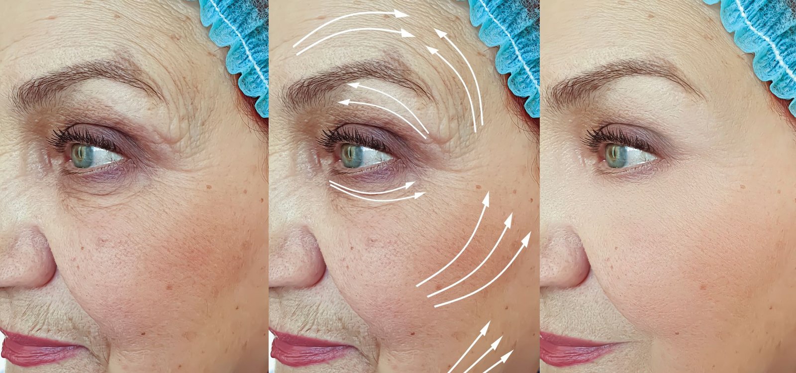 Fine lines commonly appear around the eyes, known as crow’s feet. Forehead lines, frown lines between the eyebrows, smile lines near the mouth, and neck lines are also common concerns.